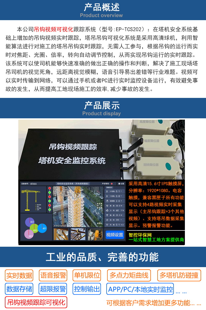 在塔機(jī)安全系統(tǒng)基礎(chǔ)上增加的吊鉤視頻實(shí)時(shí)跟蹤,塔吊吊鉤可視化系統(tǒng)是采用高清球機(jī),采用智能算法進(jìn)行對(duì)施工的塔吊吊鉤實(shí)時(shí)跟蹤,無(wú)需人工參數(shù),根據(jù)吊鉤的運(yùn)行而實(shí)時(shí)調(diào)焦,對(duì)焦,而實(shí)現(xiàn)的吊鉤運(yùn)行的實(shí)時(shí)跟蹤。改系統(tǒng)可以使司機(jī)能夠快速準(zhǔn)確的做出正確的操作和判斷,解決了施工現(xiàn)場(chǎng)塔吊司機(jī)的視覺(jué)死角,遠(yuǎn)距離視覺(jué)模糊,語(yǔ)音引導(dǎo)易出差錯(cuò)等行業(yè)難題。視頻可以實(shí)時(shí)傳輸?shù)骄W(wǎng)絡(luò),可以通過(guò)手機(jī)或者PC進(jìn)行實(shí)時(shí)監(jiān)控設(shè)備運(yùn)行,有效避免事故的發(fā)生,從而提高工地現(xiàn)場(chǎng)施工的效率,減少事故的發(fā)生。