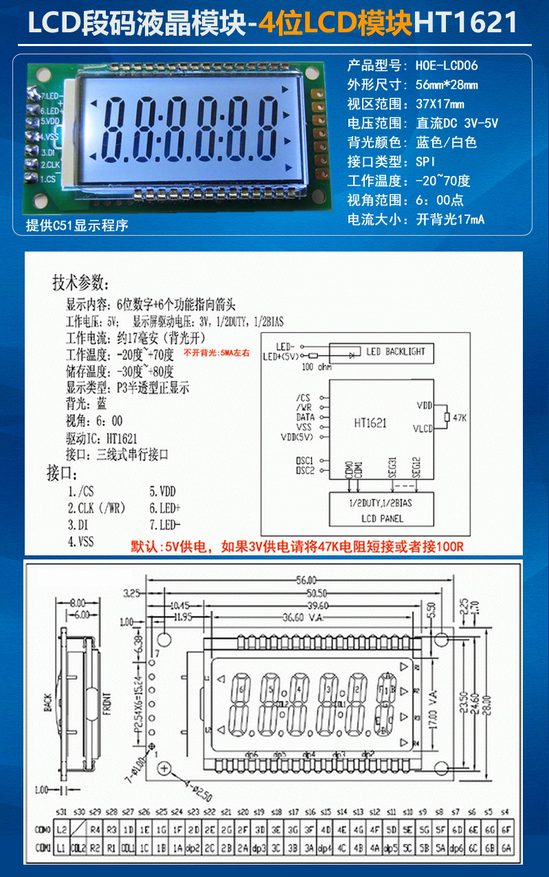 6位LCD段碼液晶模塊HT1628驅(qū)動含背光