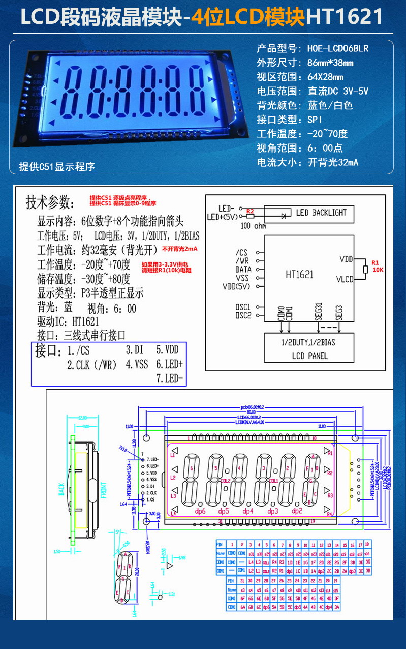 大尺寸86*38-6位液晶LCD段碼模塊