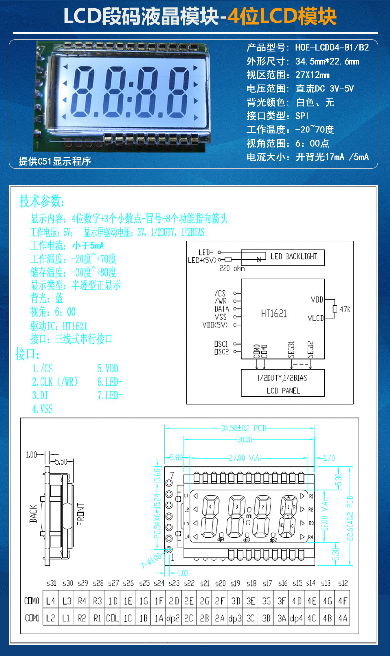 小尺寸4位液晶LCD段碼模塊帶HT1621驅(qū)動