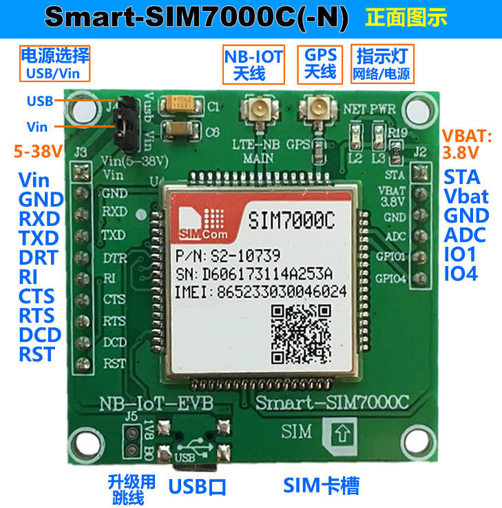 Smart-SIM7000C NB-IOT開(kāi)發(fā)模塊。支持LTE CAT-M1(eMTC)、NB-IoT和GPRS/EDGE,,支持USB通訊供電、外接
