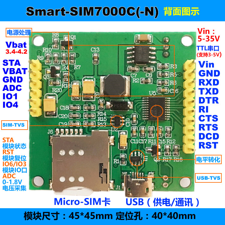 5V-38V供電,不支持語(yǔ)音功能,采用Mcro-SIM卡自彈卡槽。 可接3.7-4.2V鋰電池;