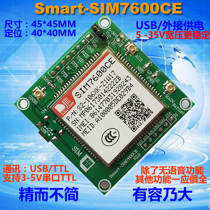 HOE-Smart-SIM7600CE 4G開發(fā)模塊。支持全網(wǎng)通,支持USB通訊供電、外接5V-38V供電,不支持語音功能,采用Mcro-SIM卡自彈卡槽。 可接3.7-4.2V鋰電池;