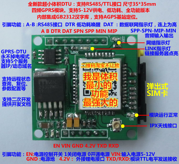 GPRS-DTU模塊,超小體積:35*35MM,支持RS485、TTL通訊,支持5-12V供電,超低功耗。支持GB2312字庫,四頻支持移動聯(lián)通的2G/3G/4G卡.